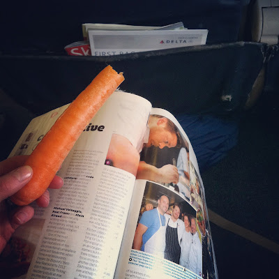 chomping on a huge carrot on the plane: